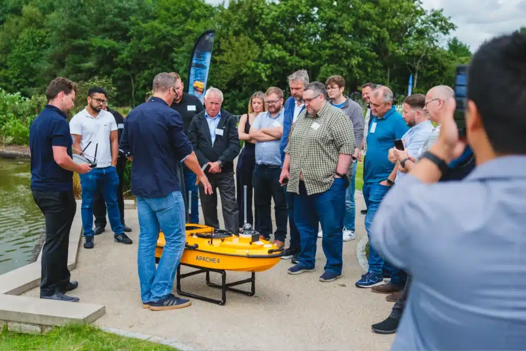 The USV collected data live on the water, which we streamed to the screen indoors. Presentations showed the kind of accurate data the Apache can produce, and our team discussed how it’s been used on real jobs. We demonstrated the autonomous navigation features, and explained how the Apache 4 is game-changer for carrying out complex surveys safely from the shoreline, reducing risk and increasing efficiency.