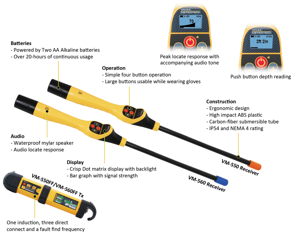 The VM-500 Series receiver is a compact, general-purpose utility locator designed to detect buried services quickly and accurately. Built for everyday use across a variety of job sites, the VM-500 receiver offers the essential features needed for efficient power and signal tracing in a durable, easy-to-use package.